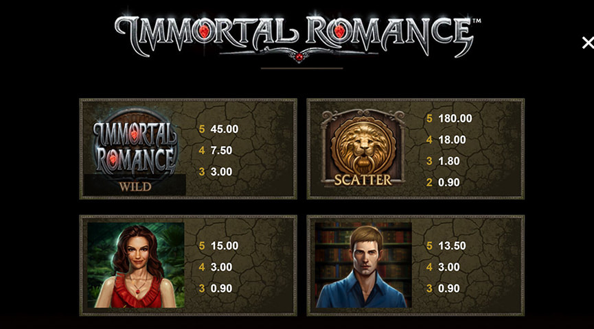 Trò chơi thú vị này lấy chủ đề về chuyện tình yêu của ma cà rồng với các biểu tượng được thiết kế theo phong cách gothic độc đáo cùng bối cảnh u ám và nhạc nền chân thực. Bố cục của Immortal Romance cũng dễ nắm bắt, với 5 cuộn và 243 đường chiến thắng.